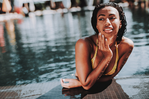 Portrait of Young Black Woman Relaxing in Pool. Beautiful African Girl in Bikini Enjoying Sunny Day at Poolside. Attractive Happy Woman Swimming in Outdoor Hotel Pool. Summer Vacation Concept